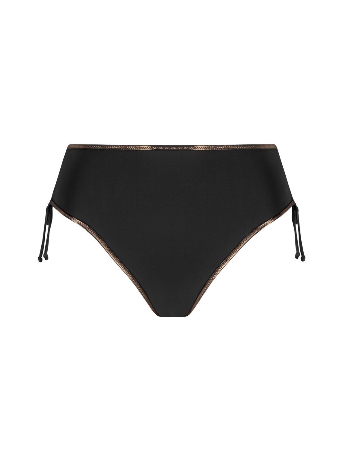 Hoge slip, omhullend achteraan en breed langs de zijkanten. Optimaal comfortRegelbaar langs de zijkanten. Taille en dijen aan de voorkant geaccentueerd door gemetalliseerde boord.79% Polyamide, 21% Elasthanne