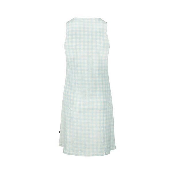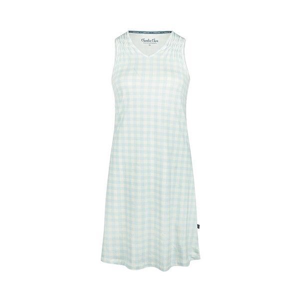Deze Charlie Choe dames singlet jurk in lichtblauw heeft een frisse en luchtige uitstraling dankzij het subtiele ruitpatroon. De mouwloze pasvorm en de lichte V-hals maken dit nachthemd ideaal voor warme zomernachten of ontspannen dagen thuis. Het zachte materiaal van 95% katoen en 5% elastaan voelt comfortabel en ademend aan en beweegt soepel met je mee. Met deze Charlie Choe singlet dress geniet je van zorgeloze momenten in een zomerse en comfortabele stijl.- 95% Cotton/ 5% Elastane