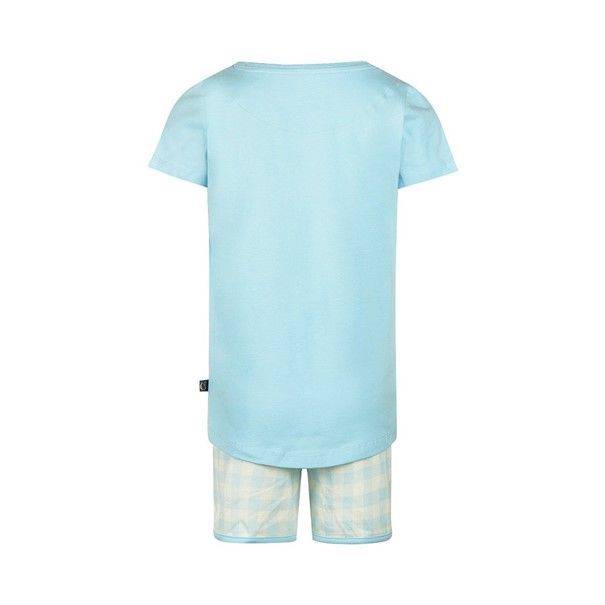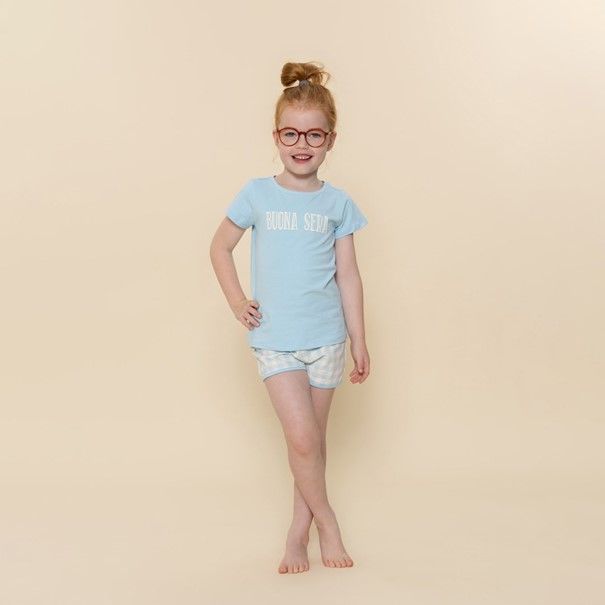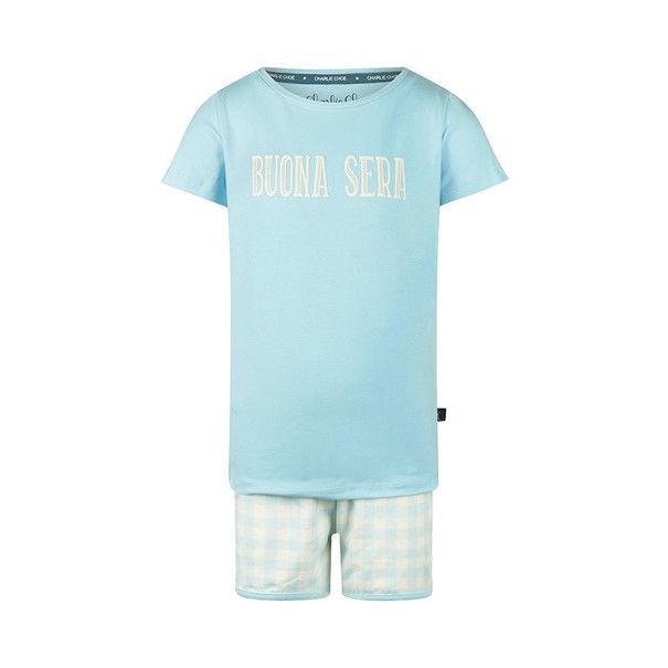 Een vrolijke avond en een goede nachtrust, dat is wat deze Charlie Choe short set voor meisjes je biedt. Gemaakt van zacht en ademend 95% katoen en 5% elastaan, biedt dit pyjama setje ultiem comfort voor de zomerse nachten. De lichtblauwe top met de Italiaanse tekst 'Buona Sera' en de bijpassende geruite short stralen vrolijkheid uit. Perfect voor ontspannen momenten, of je nu gaat logeren of thuis een filmavondje hebt.- 95% Cotton/ 5% Elastane