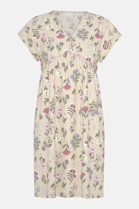 Het nachthemd met korte mouwen in de kleur Almond Milk uit de serie Botanic Garden betovert met een nostalgische uitstraling en een vrouwelijke bloemenprint. De aangename katoen/modal-interlock overtuigt door zijn lichtheid en voelt bijzonder zacht aan op de huid. De soepele snit zorgt voor een hoog draagcomfort en maakt het nachthemd tot de ideale metgezel voor ontspannen nachten. - 50% Modaal, 50% Katoen- Machinewasbaar op 40° C, fijne was, niet geschikt voor de droger