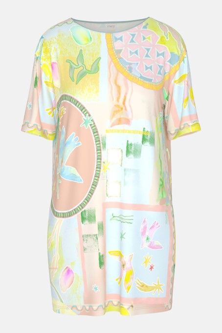 Een echte blikvanger is ons bigshirt in de kleur Breezy Blue uit de serie Mystic Voyage. Het bigshirt met korte mouwen valt mooi soepel en heeft een expressieve, digitale all-overprint. Zachte pasteltinten, gecombineerd met kunstzinnig geschilderde, symbolische elementen zoals vogels en exotische vruchten, geven het model een moderne, creatieve touch. Het zachte modalmateriaal met elastaan zorgt voor een aangenaam licht draagcomfort. Ideaal als comfortabele nachtkleding of casual loungewear. - 94% Modaal, 6% Elastaan- Machinewasbaar op 40° C, fijne was, niet geschikt voor de droger