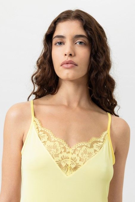 De camisole in de kleur Sunny Honey uit de serie Poetry Vogue overtuigt met zijn vrouwelijke lichtheid en elegante draagcomfort. De smalle, verstelbare bandjes zorgen voor een individuele pasvorm, terwijl de hoogwaardige materiaalkwaliteit aangenaam zacht aanvoelt op de huid. Delicate kanten details onderstrepen de vrouwelijke uitstraling en geven de camisole een elegante, sensuele touch. Ideaal als stijlvol lingerie-item of als fijne layering-top. - 93% Viscose, 7% Elastaan- Machinewasbaar op 30° C, fijne was, niet geschikt voor de droger