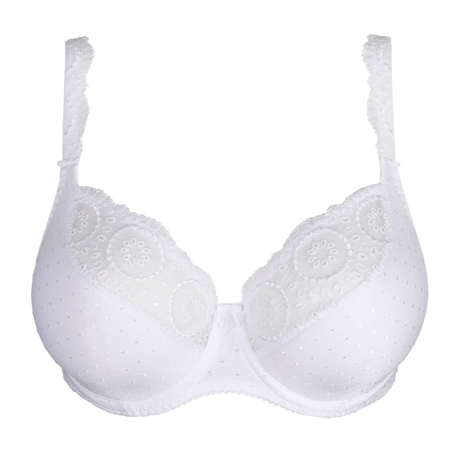 PrimaDonna Osino is vintage chic met broderie anglaise en een zalige fit.- Comfy voorgevormde beha met beugel- Stijlvol, niet-transparant design- Schouderbandjes om te laten zien- Tijdloze vintagelook in wit.