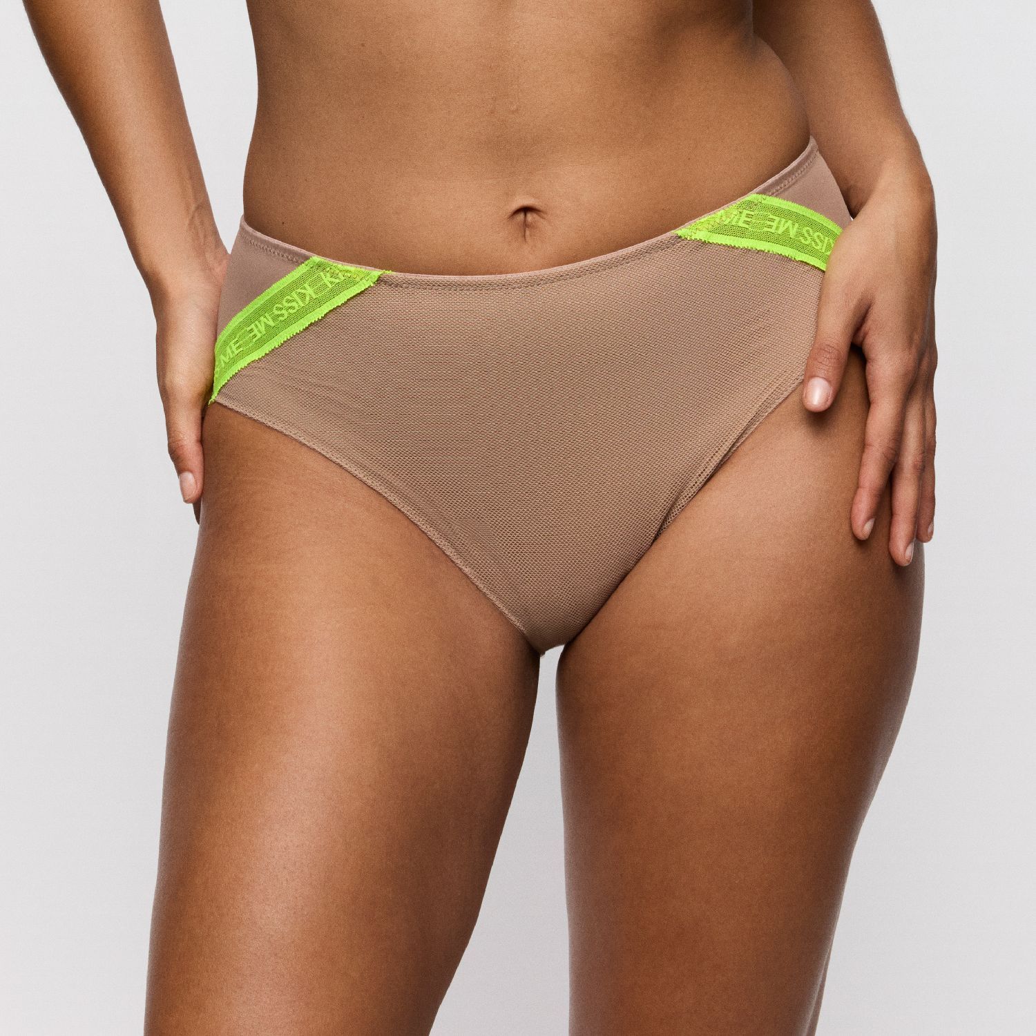 Sexy lingerie in luchtige mesh - met een boodschap.- Hoge tailleslip voor een cool retrosilhouet.- Hippe look met neon highlights